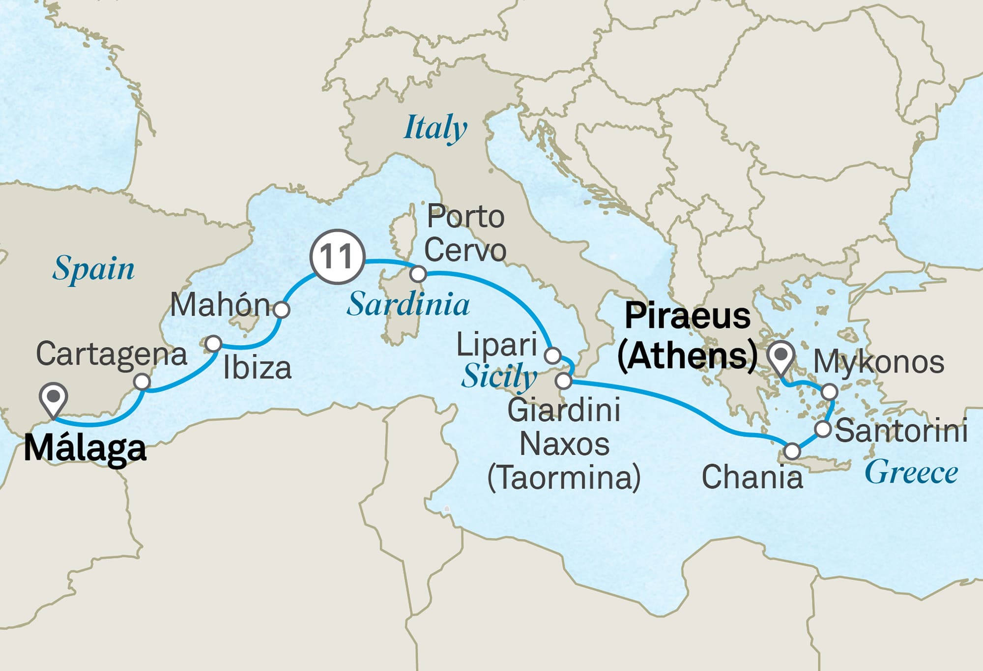 Visit the dazzling Greek isles of Mykonos, Santorini, and Crete before cruising to Italy’s chic Porto Cervo and Spain’s vibrant Ibiza.