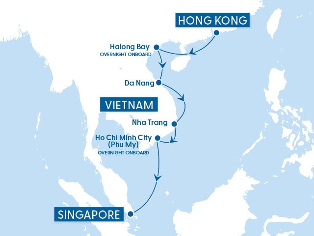 Itinerary snapshot: Hong Kong → Halong Bay (overnight onboard) → Da Nang → Nha Trang → Ho Chi Minh City (overnight onboard) → Singapore