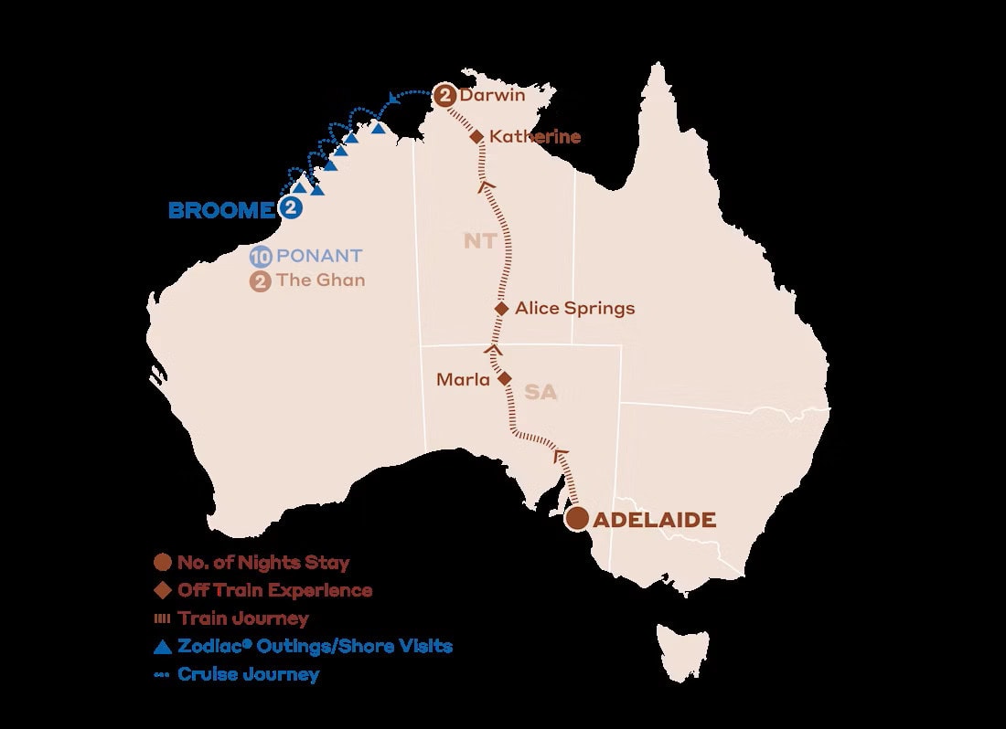 Combine The Ghan's outback journey with a Kimberley cruise aboard PONANT's Le Jacques Cartier or Le Soleal, travelling from Australia's red heart to its wild, turquoise coast on one remarkable rail and sail adventure.